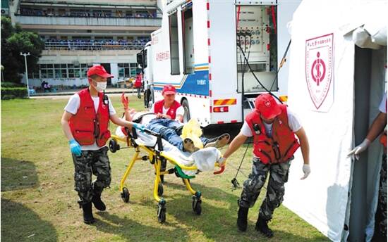 演练内容分为灾难事故现场检伤分类、移动医院的展开及救治演练、直升机空中救援演练3个科目。救援队员迅速对现场受伤人员进行“检伤分类”,并开展了“医疗救治”。救援队有序分工,在观察帐篷对轻型、中型“伤员”进行救治观察,在抢救帐篷对“危重患者”进行“抢救”,在手术车开展闭式引流、清创缝合等中小型“手术”。同时,依序联系航空医疗救援,将“危重伤患”送往中山七院进一步救治……演练过程紧张有序,救援队员训练有素。上午11时30分,演练圆满完成。