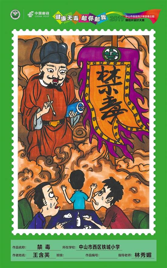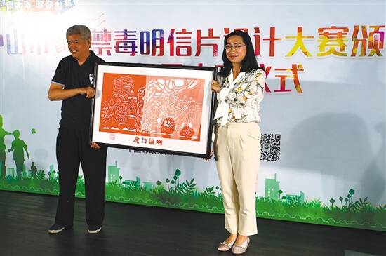活动还为中山市首届青少年禁毒主题明信片创作大赛获奖选手进行颁奖。大赛自4月开展以来,得到了全市青少年学生的积极响应和广泛参与,共收到来自105所学校的1600余幅作品,最终评选出一等奖5名、二等奖10名、三等奖15名、优秀奖70名、最具人气奖20名以及优秀指导老师5名、优秀组织单位10个,作品包含水墨画、油画、工笔画、刻板画、剪纸、书法等多种类型原创设计。其中一等奖作品作为首个中山禁毒题材的邮资明信片已被国家邮政部门批准在全社会予以发行。