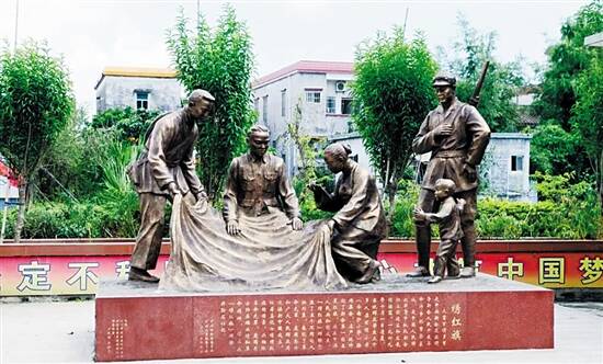 桃荫别墅旁的“绣红旗”铜像,再现了大鳌群众当年的革命情怀