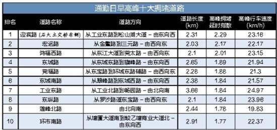 在东莞,最拥堵的道路有哪些呢?《报告》显示,石大立交桥东侧的迎宾路成为东莞今年以来的新“堵王”。在今年第三季度92天里,这条路有76天发生拥堵。另外,早高峰拥堵路段前三甲当中,还有宏远路和鸿福西路;晚高峰拥堵路段前三甲则有虎门大道和锦绣路。而迎宾路,则同时获得通勤日东莞早高峰和晚高峰十大拥堵道路的榜首。