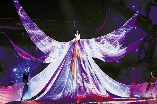 本届“猫晚”在舞美上可谓下了血本。晚会现场采用“六边形”作为统一的设计元素,创新打造了47个六棱柱状的移动舞台,在LED地屏上变换出多种组合形态。比如秦岚吊着威亚演唱《逆流而上的你》,拖地长裙被伴舞拉起展开,宛若盛开的花朵。此外,易烊千玺以复古大框眼镜的雅痞造型出场,歌还没唱完网友已经求起了同款眼镜;腾格尔版《High歌》编排得仿佛百老汇歌舞般绚烂;韩红首次以说唱歌手“XXXL”形象亮相,时髦的造型一度令网友没敢认……