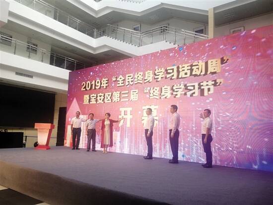 12日,2019年宝安区“全民终身学习活动周”暨宝安区第三届“终身学习节”开幕式举行,今年的活动主题是“推动全民终身学习,加快建设学习大国”。开幕式上还分别为获评2018年度“深圳市学习型社区”及“宝安区学习型示范社区”社区的代表授牌;为获评2018年度深圳市全民终身学习活动周先进单位及个人代表颁发证书;为获评2019年度宝安区“终身学习品牌(团队)”颁发证书;为获评2019年度宝安区“百姓学习之星”颁发证书。在活动期间,194场公益培训陆续展开,还将开展各类系列活动,主要包括“六个一”活动:举行一场“宝安第一课”知识擂台赛;评选表彰一批社区教育学习典型;举办一场终身教育成果展;开展一系列免费教育培训活动;召开一次“阅读社区标准”建设体系研讨会;开展“多读一本书”系列活动。