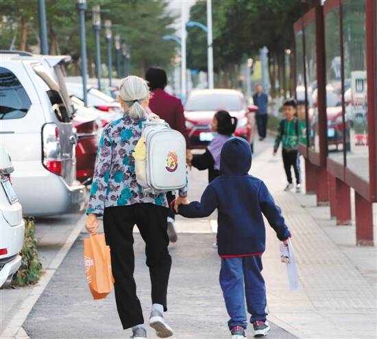 南海区一小区的家长接幼儿园孩子放学回家