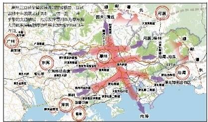 根据《规划》,惠州市“丰”字交通主框架由“三横一竖”4条轴线组成:其中,第一“横”由沿江交通轴线快速通道和国道G324北上组成;第二“横”由中部交通轴线快速通道和东西交通轴线快速通道东段组成;第三“横”由东西交通轴线快速通道与南北交通轴线快速通道惠东支线组成;一“竖”为南北交通轴线快速通道。