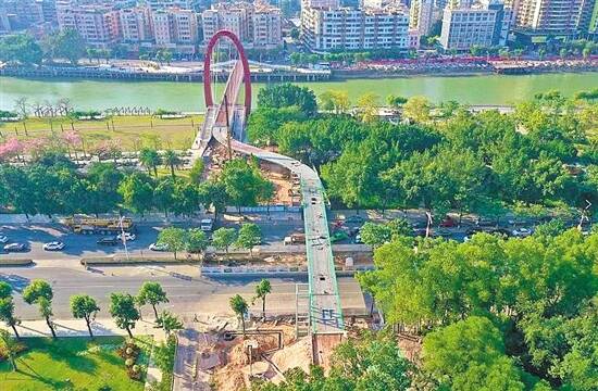 据悉,这十大在建项目包括釜山人行天桥(二期)、江海云道、儿童公园、江门河南岸道路、城市阳台、水上人家公园、下沙人行天桥、横坑村微改造、桃花园扩建、外海沿江路绿化带。进展较快的是位于城央绿廊中心的釜山人行天桥(二期),施工方介绍,天桥二期工程主桥钢箱梁于21日完成吊装合龙,下一步将进行桥面铺设、安装防护栏以及桥面亮化等扫尾工作。