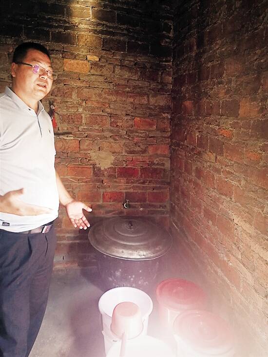 刘永辉走进五保户朱军威的厨房看他中午吃的是什么(地上摆的一排水桶,是朱军威用上自来水之前,每天走一公里挑河水沉淀用的)