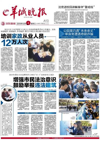 羊城晚报讯 记者沈婷婷、通讯员张俊杰摄影报道:12月3日,“南粤家政”工程促进就业仪式在深圳启动,会上透露,2019—2021年,深圳将建设市级家政服务培训示范基地10家以上,实施母婴服务、居家服务、养老服务、医疗护理四大类别重点培训项目,开展家政服务从业人员培训12万人次以上。家有老人孩子的市民最发愁的就是请不到好保姆。今后不用再发愁了,3日发布的《深圳市实施“南粤家政”工程促进就业工作方案》(以下简称《方案》)明确提出深圳实施“南粤家政”工程的工作目标。2019—2021年,将建设市级家政服务培训示范基地10家以上,制定完善家政服务业技能培训标准和评价体系,实施母婴服务、居家服务、养老服务、医疗护理四大类别重点培训项目,开展家政服务从业人员培训12万人次以上,全面实现从业人员素质有提升、就业有渠道、权益有保障,推动深圳家政服务业提质扩容。