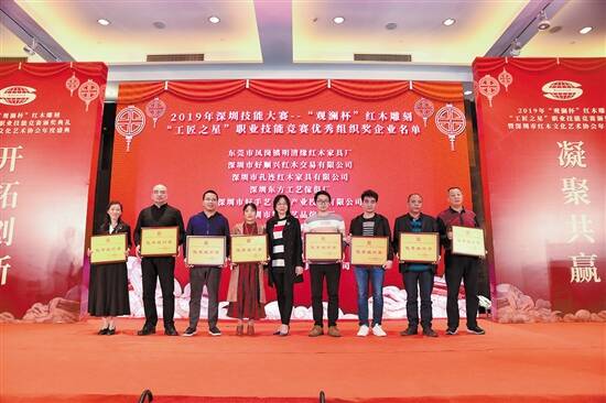 12月27日晚,2019年深圳技能大赛——“观澜杯”红木雕刻“工匠之星”职业技能竞赛颁奖盛典暨深圳市红木文化艺术协会2019年年会晚宴举行。当晚的颁奖盛典整个过程贯穿“感谢”二字,深圳红木行业在本次比赛中取得较好成绩:一个二等奖,五个优秀奖,七个佳作奖。此外,现场颁发了24个优秀组织奖,感谢他们对本次雕刻大赛的支持和付出。据悉,此次竞赛以“祖国颂—庆祝中华人民共和国建国70周年”为主题,通过构造严谨、雕饰精湛、形式新颖的红木雕刻艺术,弘扬中国传统的红木文化和“工匠精神”。大赛于11月4日开幕,11月8日圆满落幕,整个大赛产生优秀作品百余件。
