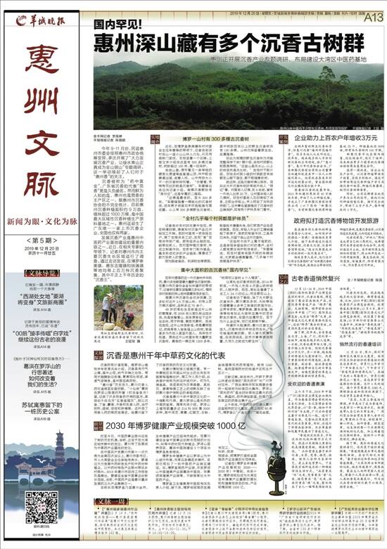 金羊网记者 李海婵 陈骁鹏惠州“两会”中,“养在深闺无人知”的沉香产业成为热议的话题。不少政协委员建议,惠州应充分发挥优势,推动沉香产业健康快速发展,打造现代化、国际化的“沉香之都”。而就在2019年12月20日,《惠州文脉》曾整版报道《国内罕见!惠州深山藏有多个沉香古树群》(见下图),深度聚焦沉香产业,引起了各界对“惠州香”的关注。