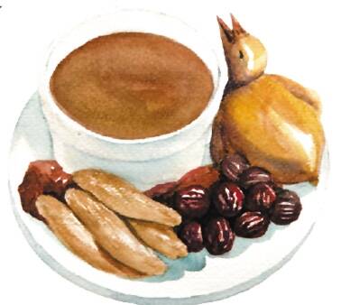 烹制方法:各物洗净,羊排骨切块,放入沸水中焯水。上述食材一同放入锅中, 加清水2000毫升(约8碗水量),武火煮沸后改文火煲1.5小时,放入适量精盐调味即可。此为3~4人量。