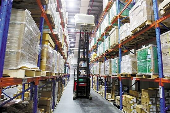 珠海广丰物流有限公司的仓库内,工人正用叉车搬运货物