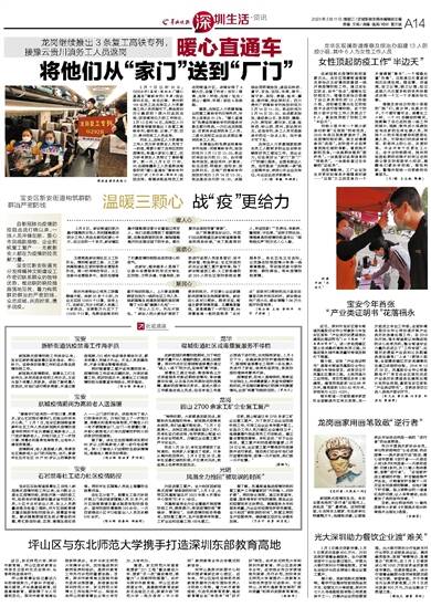深圳市某物业公司员工陈霄跨越千里,奔波20多个小时,为业主买回12000个口罩,送货上门。在新安,刘女士和家人走遍二十家药店,自费数万元买下了11000个口罩,免费送给街坊和素不相识的路人;上川黄连胜醒狮团自发为一线的社区工作人员、居家隔离生活遇到困难的居民捐赠了400套“健康小礼包”……
