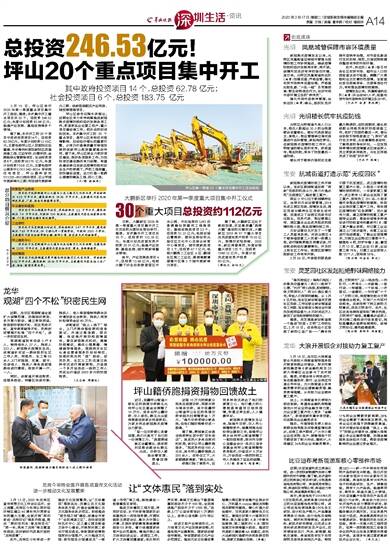 3月15 日,坪山区举行2020年第一季度重点项目集中开工活动,据悉,本次集中开工重点项目共20个,总投资246.53亿元,年度计划投资83.68亿元。涵盖产业发展、基础设施等多个领域。据了解,本次开工的20个项目中政府投资项目14个,总投资62.78亿元,年度计划投资13.10亿元,主要包括坪山区人民医院迁址重建、平乐骨伤科医院新院区改造装修工程、江边学校、沙壆学校、金辉路综合管廊等项目。社会投资项目6个,总投资183.75 亿元,年度计划投资70.58 亿元,主要包括坪山商务中心G11340-8034 号宗地住宅项目、坪山碧岭汤坑G11325-8023地块项目、正山甲城市更新单元三期、均田城市更新单元二期、创新型装配式产业用房、城投智园等项目。