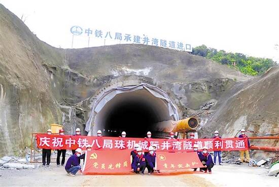 羊城晚报讯 记者郑达,通讯员孟庆虎、侯力文、寿春苗摄影报道:4月1日上午9时28分,在井湾隧道施工现场,随着最后一声爆破声响起,隧道出口处被炸开,至此,珠机城际二期工程首座隧道——井湾隧道顺利贯通。由中铁八局集团承建的珠机城际轨道交通井湾隧道位于珠海市横琴新区,是珠三角轨道交通网的重要组成部分,同时也是一条兼顾城市轨道交通功能的城际铁路。隧道为单洞双线形式,全长398米。