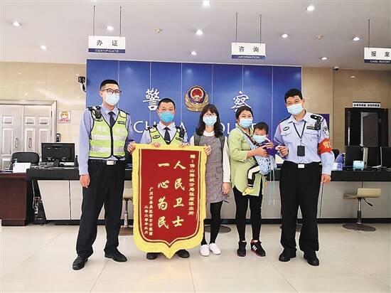 “现在是疫情期间,我小孩发着高烧,本以为没有人敢帮助,袁警官不但没有推辞,还为我的孩子开辟了生命通道,抢到了宝贵的治疗时间。”回忆起当晚被救的情景,黄女士依旧感动不已,念念不忘要找机会感谢。小孩出院后,住在番禺的黄女士便托人制作了这面感谢锦旗,当天带着小孩回医院复诊后,便领着婆婆和小孩上门感谢“救命恩人”。袁高群憨厚一笑,回应道:“作为一名人民警察,这是我应该做的,就算有可能被感染,我也要先救人再说。”