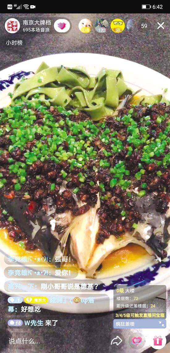 在南京大牌档的直播中,更多是使用“网红达人”作为直播主角。以3月20日那场直播为例,化名“金小妹”的美女主播,和隔壁的帅气小哥一唱一和。由于是春季新菜主题,直播还扣上了历史IP,比如,“朱重八与南京菜的不解之缘”。每上一道菜,帅气小哥必抖历史包袱:吃天王烤鸭包时,就“科普”朱元璋是烤鸭界的“祖师爷”;吃鱼头时,则言江鲜菜与朱元璋发展水上兵力有关。