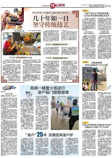 近些年,佛山的非遗传承人队伍越来越壮大。记者从佛山市非遗保护中心获悉,目前,佛山有市级非遗项目131项,先后被评出过市级以上(包括市级)非遗传承人224人;省级非遗项目48项,先后被评出过省级以上(包括省级)非遗传承人58人;国家级非遗项目14项,先后被评出过国家级非遗传承人15人。