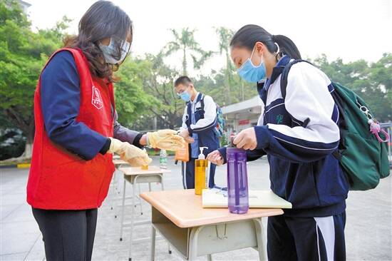 宝安中学初三学生洗手消毒后入校