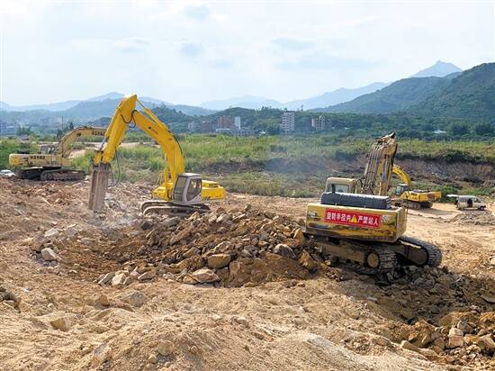 在距离新圩镇几十里开外,惠阳未来经济的另一重要增长极惠阳(象岭)智慧科技产业园(以下简称“象岭”)也正在逐步迈向轨道。在三和街道棠梓岭路段右侧的一片空地上,中午12时仍是一片热火朝天:两台大型打桩机正在作业,搅拌车与工程车来回穿梭,大片土地已被盘整出来,工人在铺设施工管线。这是象岭首个动工项目——凯中精密的建设现场。