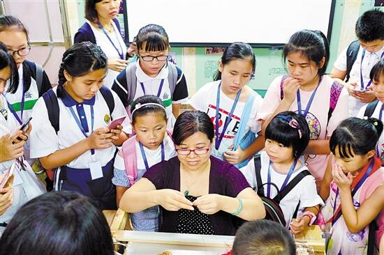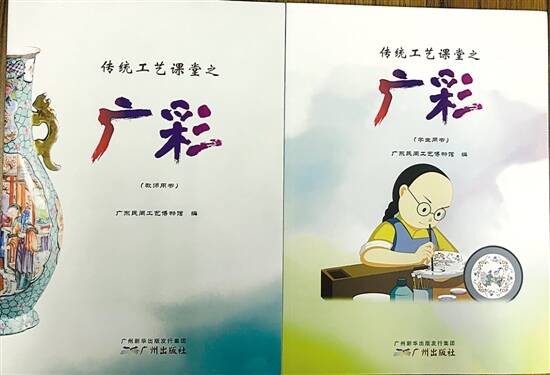 同时,为了提高学校参与性,为学校提供课程设计、课程资源,该馆编写出版了《传统工艺进课堂》之广彩、广绣、剪纸校本教材,包含教师用书、学生用书、教师资源卡、学生学习卡,还有动漫视频、多媒体游戏,“教材内容丰富,形式多样,这样老师教得轻松,学生学得有趣”。依托教材,围绕着培训老师、为学校送展、举办研学活动、为学生举办作品展等开展了一系列馆校合作,“希望将传统工艺进校园持续、深入地推进”。