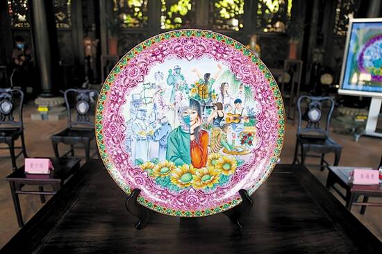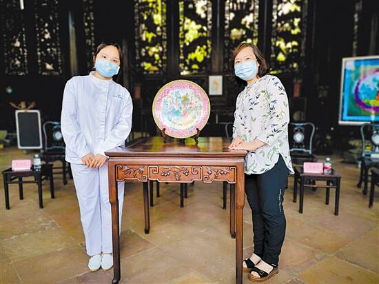 中国工艺美术大师、广东省非物质文化遗产广彩技艺传承人翟惠玲以朱海秀为原型创作了广彩作品《青春之光》,近日,她把作品捐献给广东民间工艺博物馆(陈家祠),并与作品主角朱海秀“同框”。