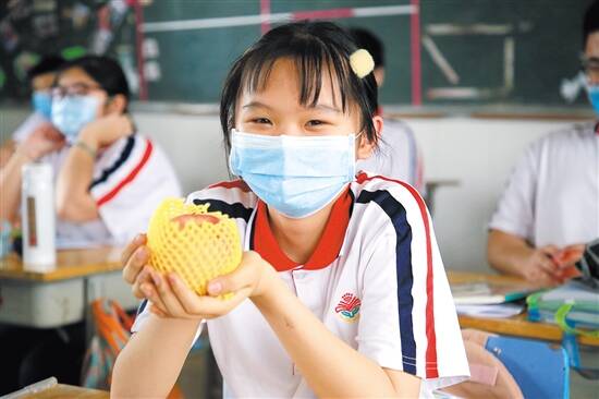 有吉利中学有班主任为同学们送上苹果,寓意“平平安安、硕果累累”