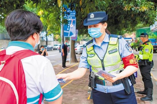 羊城晚报讯 记者郑诚、通讯员贺亚东摄影报道:5月11日,继初三高三返校复课后,佛山初高中非毕业年级也按下了春季返校的“启动键”。在禅城,公安法制副校长齐上阵,通过发放安全手册、张贴反诈禁毒海报等方式,将安全知识“铺满上学路”。