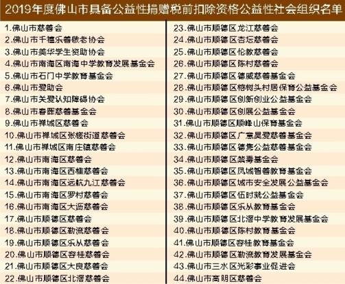 近日,佛山具备2019年公益性捐赠税前扣除资格的44家社会组织名单正式出炉,并向社会进行公示。据悉,疫情期间,不少热心人士纷纷慷慨解囊,而其中符合条件的个人向上述组织进行捐赠,可以后续选择在缴纳个人所得税时进行税前全额扣除。羊城晚报记者 欧阳志强