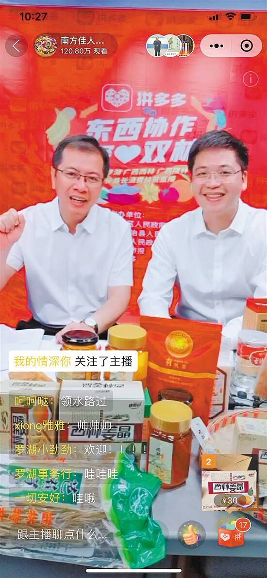羊城晚报讯 记者林园报道:“宝宝们好!我是罗湖区区委副书记、区长刘智勇,欢迎来到‘东西协作 深爱双林’深圳罗湖、广西西林、隆林消费扶贫直播专场……”12日,深圳罗湖与广西隆林各族自治县、西林县进行消费扶贫直播活动举行。截至18时,直播期间实现的销售额,相比商家日常销售最高峰,增长12倍以上。据了解,这是全国一线城市区级主官首次前往对口扶贫现场直播带货。据了解,此次直播活动是为助力扶贫攻坚,帮助农民拓销路,促增收。上午10点半,罗湖区区委副书记、区长刘智勇,广西隆林各族自治县党委副书记、县长杨科,广西西林县党委副书记、县长欧阳可爽也走进了直播间,直播推介西林和隆林的优质特色农产品。此次直播中,区长、县长“变身”主播。区长还用着时下最流行的直播卖货语言,亲切地称呼观众为“宝宝”,迅速拉近与观众的距离。在主播的热情推介下,包括姜晶、蜂蜜、土鸡蛋等许多“藏在深山人未识”的纯天然优质农产品“圈粉”无数,引来众多购买。