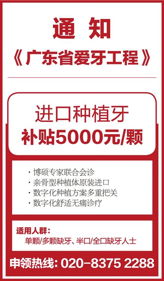 《广东省爱牙工程》是由广州广播电视台《G4出动》主办、广东省临床医学学会协办、广东省老年基金会为指导单位,德伦口腔为承办单位及唯一技术指定单位的援助活动,为让更多市民“看好牙,易看牙”,推出系列补贴政策,拨打020-8375 2288申领补贴: