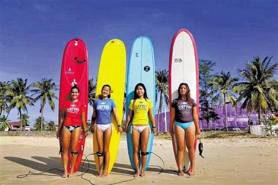 万宁日月湾冲浪的小姐姐们