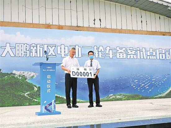 安呈斌致辞中表示,希望各部门统一思想、奋勇作为,圆满完成试点任务,并以此为契机,全面抓好社区治理、交通管理、治安维护、消防安全、慢行系统建设等工作。紧接着,徐炜代表市交安委介绍了电动二轮车备案试点工作的阶段统筹规划、政策、机制建设等。他感谢大鹏新区管委会对电动二轮车备案工作的大力支持,并充分肯定了各职能部门在电动车涉酒、涉乱、戴头盔等方面综治管理成效,对启用电动二轮车备案试点工作实现信息化、智能化管理的创新举措表示肯定。最后,杨军宣布“大鹏新区电动二轮车备案试点正式启动”,并为首位备案市民发放了大鹏新区第一张电动二轮车备案标识。