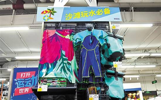 在位于广州黄埔区的迪卡侬科学大道门店内,为水上运动装备设立了专门的产品区域。三个长达30余米的货架正反两面摆放着逾20类“玩水”装备,其中除了有泳衣、泳帽、泳镜等为多数人熟知的常规商品,还有浮垫、浮潜面罩、冲浪板等少数群体热爱的水上运动设备。