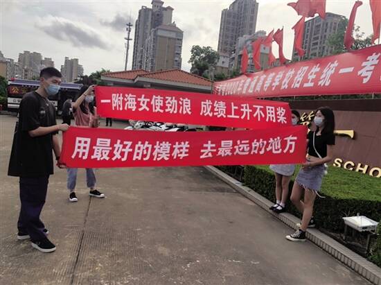 在珠海第一中学考点外,几位举着横幅的年轻人很是显眼。他们的横幅上写着“用最好的模样,去最远的地方”等“雷人”标语。记者采访得知,他们是在校大学生,朋友正在高考。他们希望这位朋友取得好成绩,然后暑假一起去旅游。