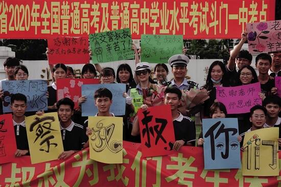在珠海斗门一中考试的学子向警察致谢