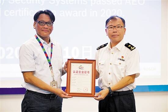 “非常感谢拱北海关认证专家组的悉心指导,虽然今年疫情对企业整体效益影响较大,但AEO高级认证企业的身份必定会使我司在国际、国内商务合作中获得更多的客户和订单。”当博世(珠海)安保系统有限公司负责人从斗门海关关长吴义荣手中接过AEO(海关高级认证企业)证书时,难掩内心的激动与自豪。日前,拱北海关企管处、斗门海关联合金湾区政府,为今年关区首家通过“经认证的经营者”(AEO)高级认证企业颁发证书。据了解,博世(珠海)安保系统有限公司是一家德资企业,主要从事防火探测系统、门禁系统、闭路监视系统等安保系统生产,一年进出口报关单在8000票左右,产品主要销往欧洲、美国。该司负责人介绍道:“企业通过AEO高级认证后,通关物流成本节省20%左右。”