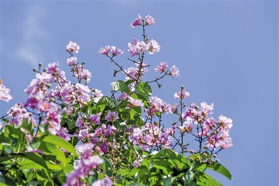 据了解,紫薇花主要有两个品种:一种是常见小叶紫薇,叶子小,且树形矮,花束成团,呈粉红色。在尖峰前路,小叶紫薇花成团成簇绽放,生机勃勃,直醉人心;另外一种是大叶紫薇,叶子稍大,树杆也高,花瓣薄透,呈紫蓝色。在朝福路两旁,粉嫩的花朵正争相怒放。
