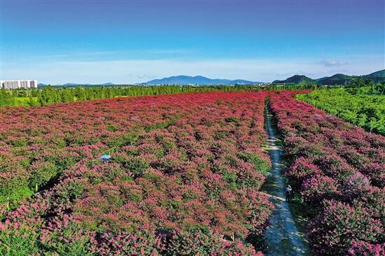 如果想欣赏大片面积的紫薇花,珠海市斗门区莲洲镇三龙村是一个不错的选择。在三龙村130亩紫薇花养殖基地里,紫薇花正处于繁盛期。粉色紫薇花圃与远处碧绿的山丘田野遥相呼应,组成一幅美丽的田园风光画卷。