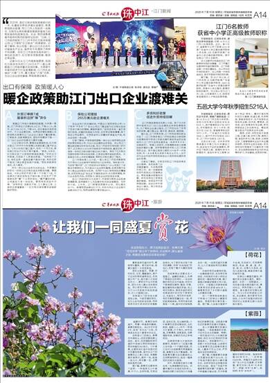 在珠海斗门的街头,紫薇花布满枝头,成团成簇地朝上绽放。其中,在西堤路和西引道的中间绿化带和两侧绿化带共种植约350株大、小叶紫薇,主要用来打造中低层次的开花景观效果。蓝天白云下的紫薇花让人赏心悦目。有摄影爱好者表示,随手一拍,就是一张大片,朋友圈一放,点赞起码是两位数。