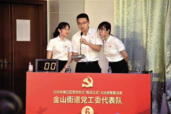 羊城晚报讯 记者危健峰、通讯员李伟英摄影报道:7月15日,梅州市梅江区党务知识“练兵比武”大比拼竞赛决赛在金山街道办事处举办,6个党(工)委代表队参加比赛,通过“练兵比武”、比学赶超,建设高素质专业化党务干部队伍,为现场观众分享了丰富的“党务知识大餐”。“发展对象未来三个月内将离开工作、学习单位的,一般不办理接收预备党员的手续。”话音未落,全场观众报以热烈掌声。决赛现场,根据习近平总书记系列讲话精神、党内法规制度及党务工作日常业务知识等丰富的竞赛内容,各代表队皆是有备而来,必答题环节开始,竞争就十分激烈。到了抢答题环节,比赛更是进入了白热化,各代表队的比分你追我赶,现场气氛紧张又热烈。最后的风险题环节,每队只有一次选择答题的机会。题目按照难易程度分为20分、40分、60分三种分值,答错、超时、放弃或不完整都要扣相应分,这让比赛变得更加扣人心弦。