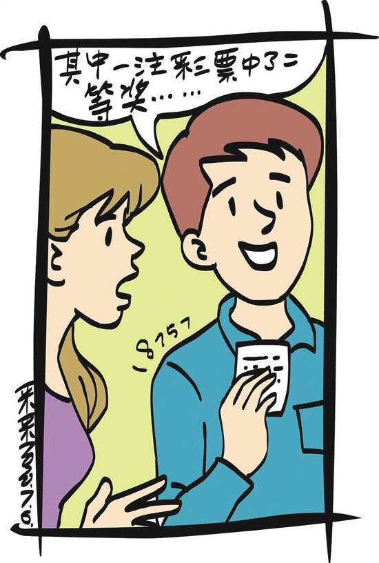 又到彩票开奖时,孙源早早备好笔纸,用心记录这期开奖号码,记着记着,孙源跳起来,揉了揉眼睛,又拿出中午买的彩票左看右看,然后一把抱起一旁看手机的蒋玲,兴奋地说:“玲,你真是我的贤妻。”