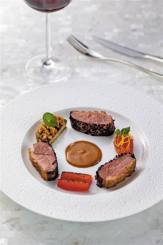 如果说蟹肉沙拉是以经典粤菜作为创作的灵感,那么主菜“全羊”则是传统法国菜中的广东风味。羊里脊、羊排与羊膝分别用三种经典法式烹饪技术制成,但是其中却带有一丝广东人吃羊的智慧——羊里脊先用柠檬叶腌制,再以低温慢煮至柔嫩三分熟,随后用焦香黄油将其煎香并带有一丝焦糖的味道。