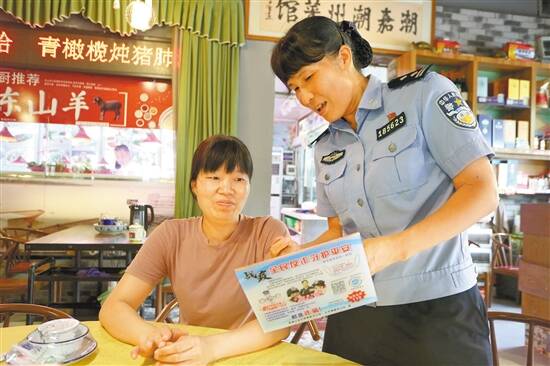 羊城晚报讯 记者周哲、通讯员关舒允摄影报道:电信诈骗,关键在防。鉴于电信网络诈骗的隐蔽性,加强宣传成为防范电信诈骗的重要手段。近日,南海黄岐派出所民警印制了一批餐台立牌,联系了部分辖区餐馆进行试点投放。7月28日中午,黄岐派出所综合室主任陈瑞贞来到辖区餐馆推广“反诈进餐桌”活动,现场开展禁毒反诈宣讲活动。不少进店用餐的顾客,被摆放在桌面上的反诈预警宣传牌吸引住。“这种宣传形式很新颖,我们等上菜的时候看一下,消除无聊情绪的同时还可以学到安全防范知识。”顾客王小姐对此连连称赞。该餐馆负责人李先生表示,会积极配合警方的宣传活动,定期组织餐馆员工学习最新反诈知识。