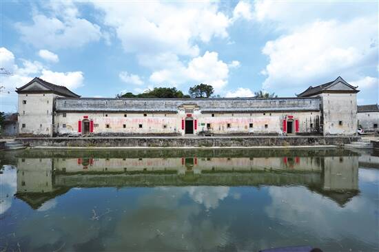 这座客家围屋呈三堂两横院落式布局,正门是牌坊式的门楼,门券上方的“碧滟楼”浮雕石匾是清代才子江逢辰所书。记者注意到,一行孔洞在围屋外墙上一字排开,用于放置枪支抵御外敌。围屋门前,一湾浅浅的荷花池倒映着晴空。池塘前的溪流上,一群鸭子怡然自得地游着泳……