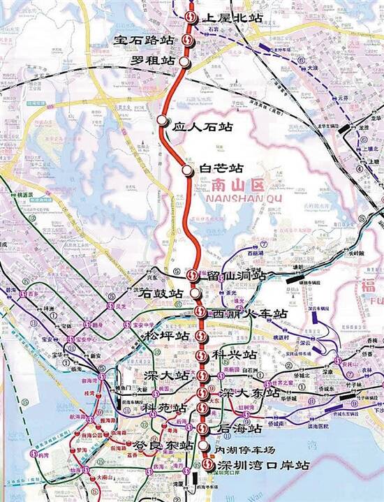 深圳市轨道交通13号线工程是支持后海中心、留仙洞总部基地、光明新城等重点建设地区发展的中部地区南北向骨干线。线路南起深圳湾口岸站,北至上屋北站,全长约22.4公里,设站16座,采用地下敷设方式。全线设一座停车场,内湖停车场位于内湖公园南侧和东滨路北侧,目前正在紧张施工中,初步预计将于2023年投入服务。