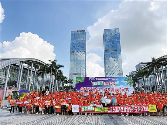 150多名成都游客在五邑华侨广场合影 图/江门市文广旅体局