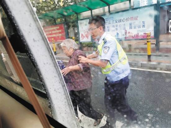 民警在风雨中护送老婆婆