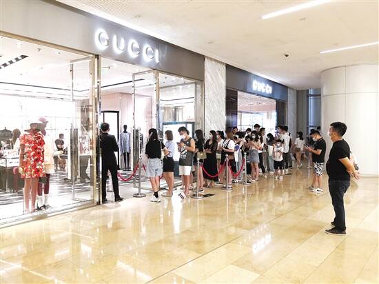 在广州太古汇,顾客在GUCCI店门前排队等候