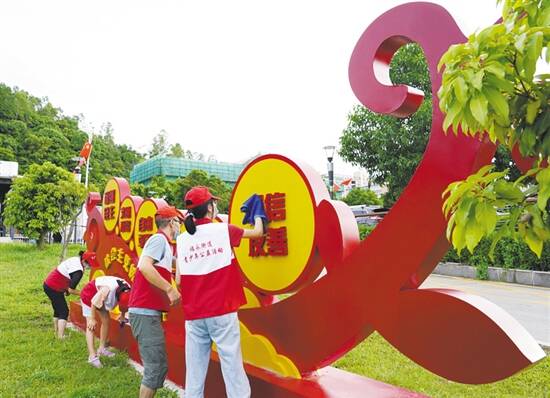 妈妈义工带着团员少年一起清洁“核心价值观立体设施”