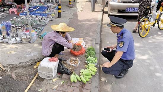 当天,禅城区城市管理和综合执法局的方队员和另外一位执法人员在巡查时,发现两位老太太正在路边蹲着,面前摆卖一些干草药和青菜。她们蹲坐在市场外人行道上,看着路人就招招手,没人就在那低声聊天。方队员立即上前进行劝导。经过一番询问,方队员了解到两位老太太都年过八旬,住在四站公交站外的城中村,卖完菜她们还要坐公交回去。她们本该享受天伦之乐,但迫于生计,奔波到人气较旺的南堤市场卖菜,实属无奈。